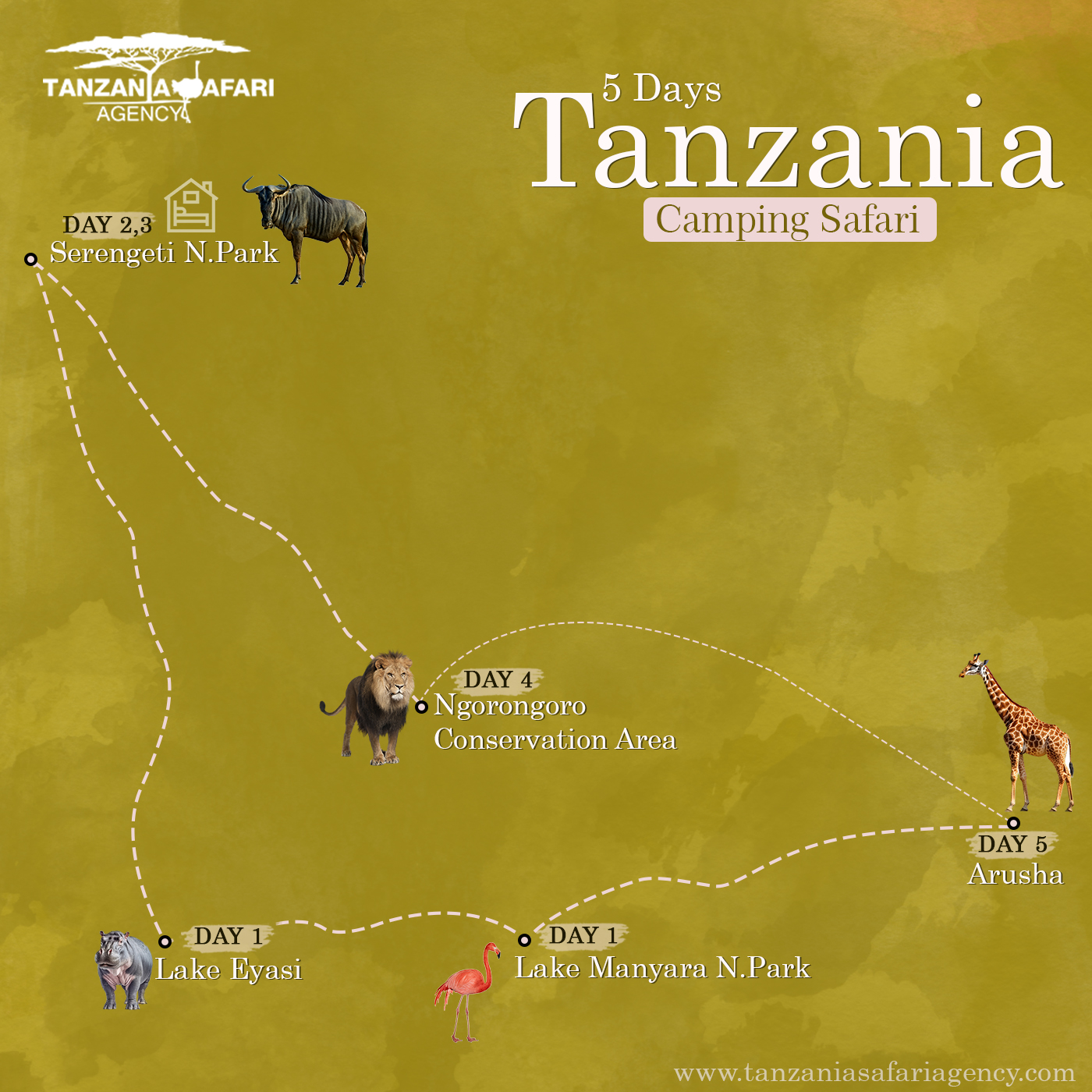 This 5 Days Tanzania Camping Safari starts when we meet you at Kilimanjaro International Airport or Arusha airport and transfer to Planet Lodge in Arusha. Later our safari manager will come for a safari briefing & leave you to spend the rest of the day enjoying the invitingly lodge’s facilities.
