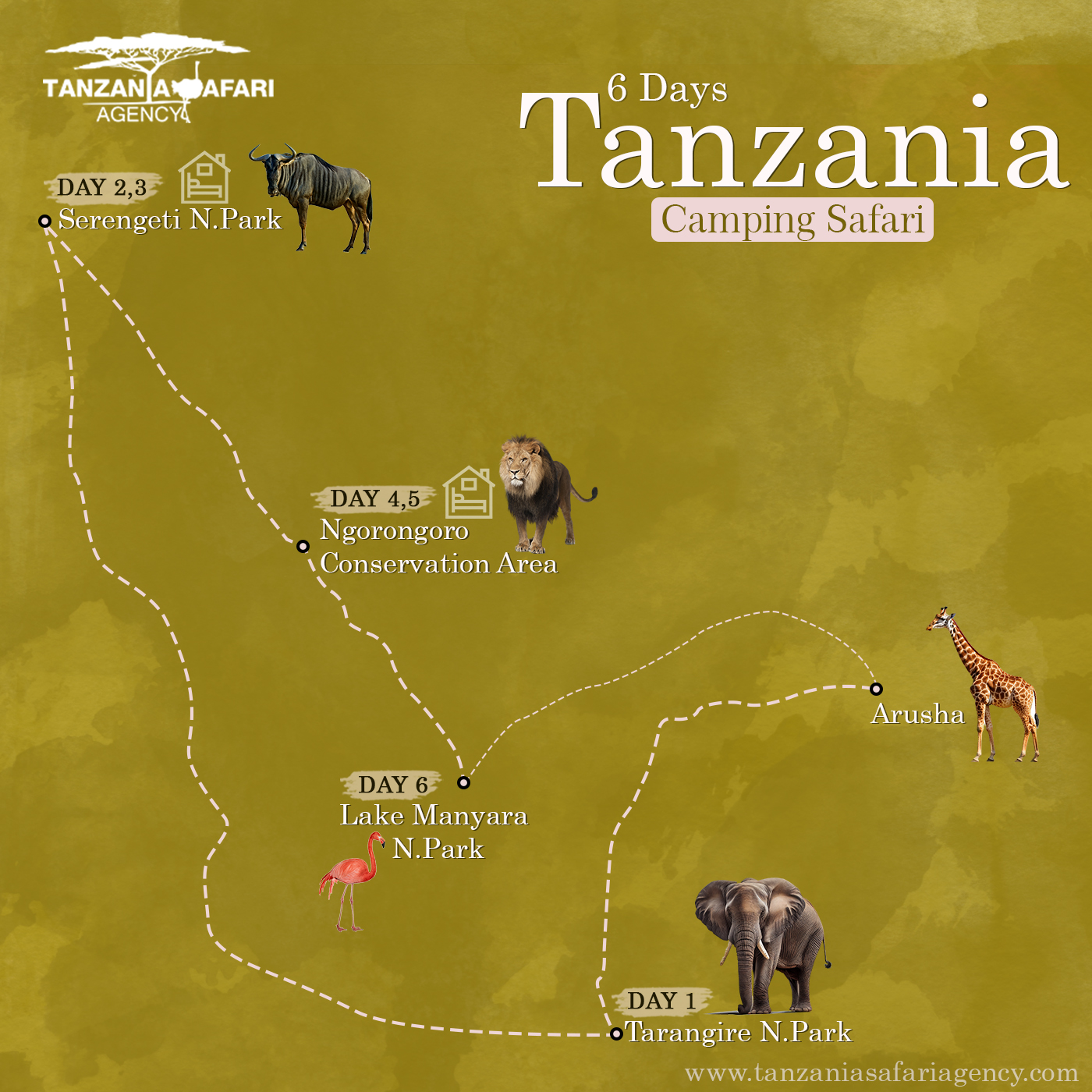 6 Days Tanzania Camping Safari thinking of a safari into the continent of Africa means a great experience & unforgettable memory. This 6 Days Tanzania Camping Safari tours will include the best Northern Tanzania Parks of Tarangire, Lake Manyara, the wild Africa Serengeti National Park & Ngorongoro Crater the nature wonders of the world, all these parks with unique features & wildlife.