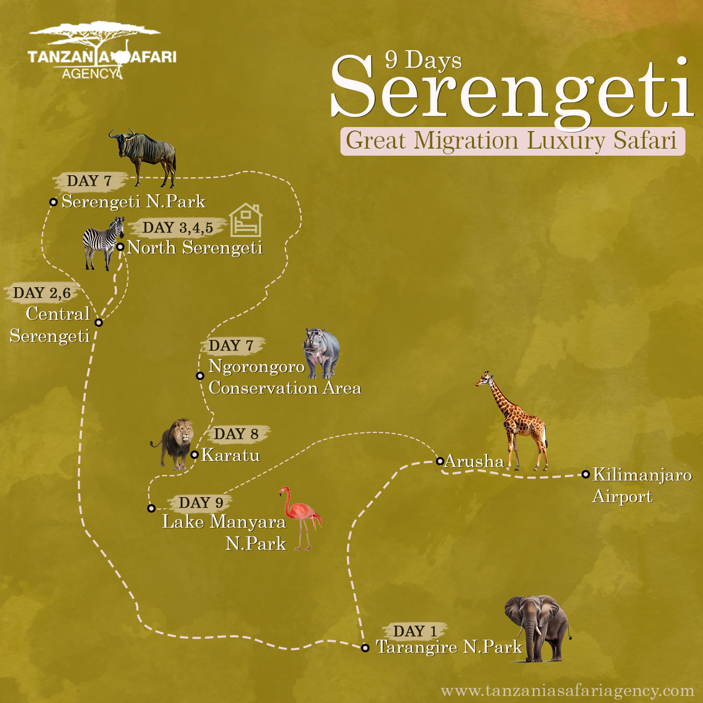 • Visit iconic destinations like Tarangire, renowned for its giant baobabs and elephants; Serengeti for its expansive plains; Ngorongoro Crater, a UNESCO site teeming with wildlife; and Lake Manyara with its flamingos and tree-climbing lions.